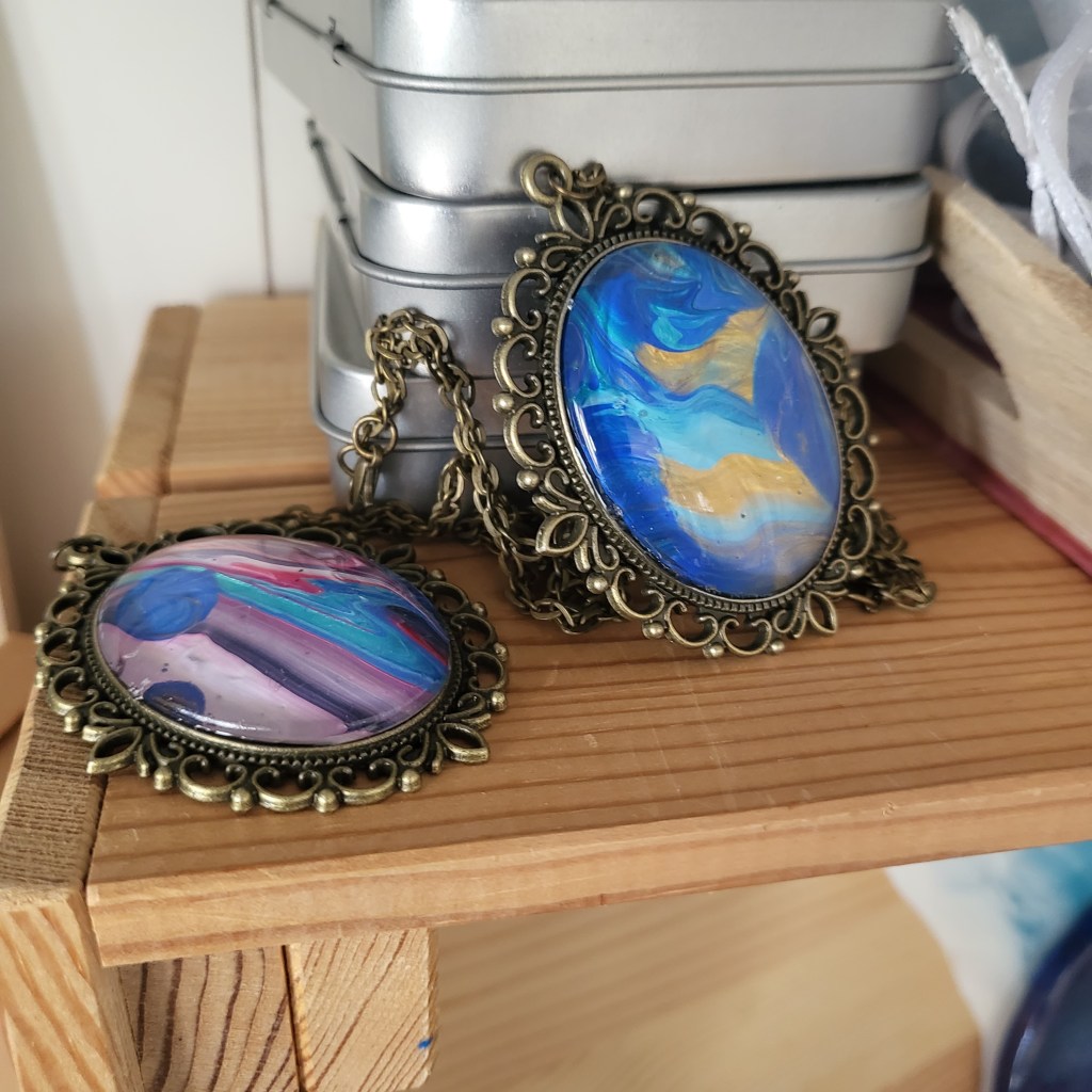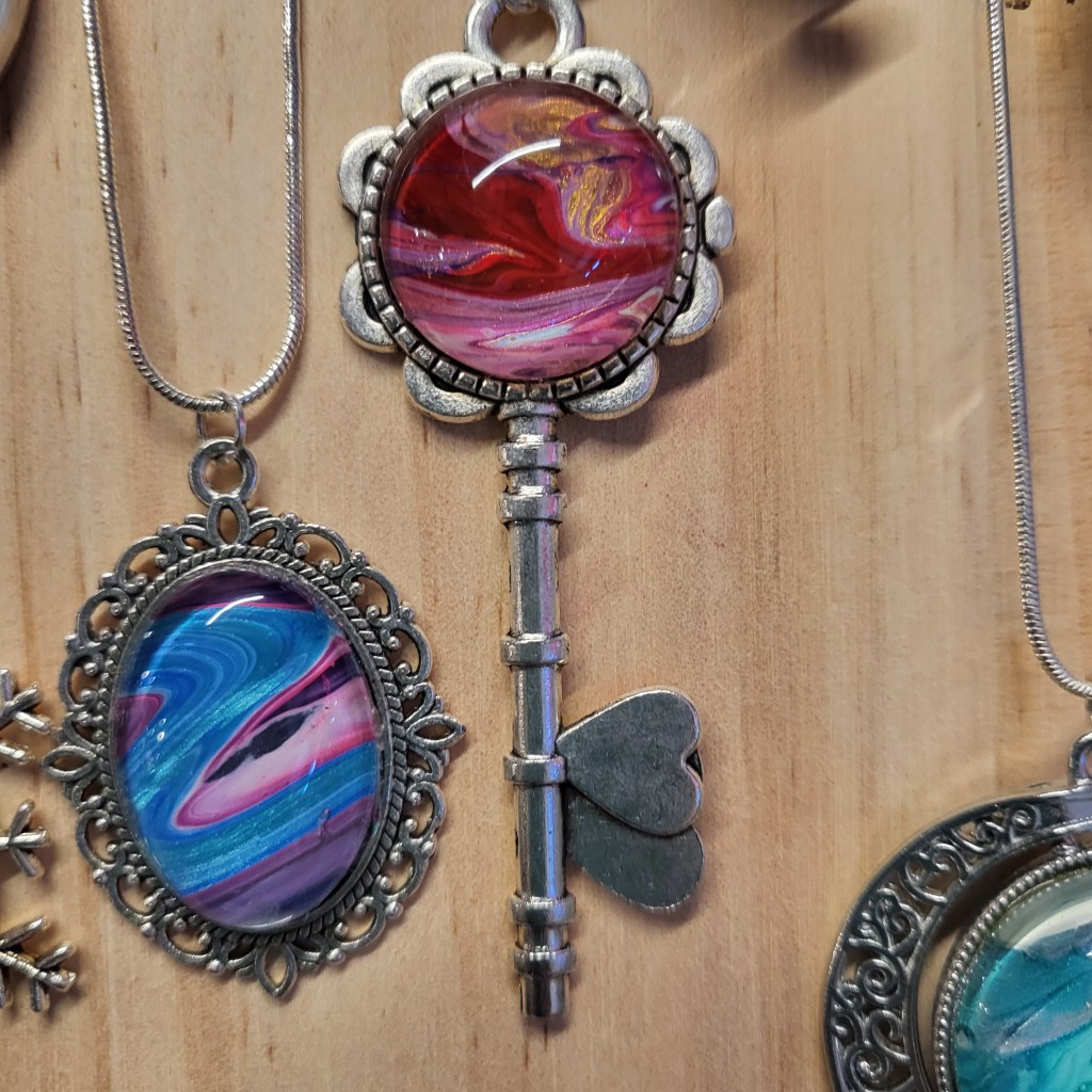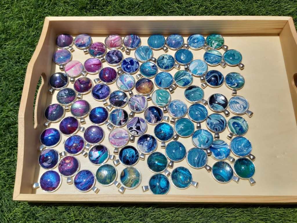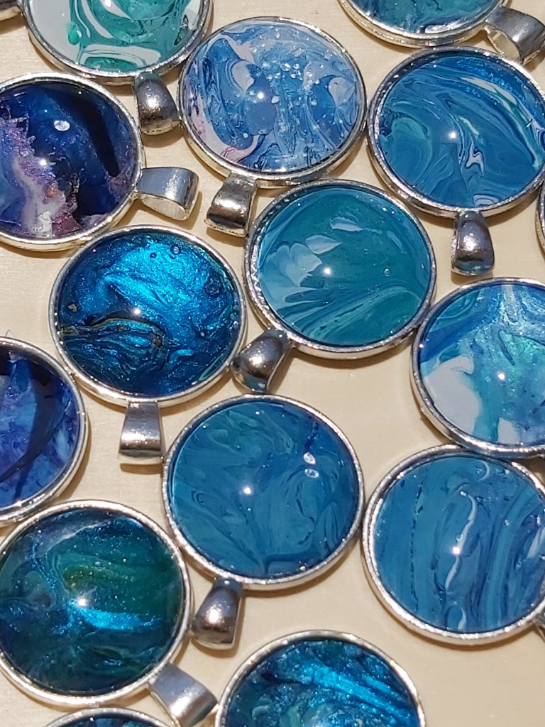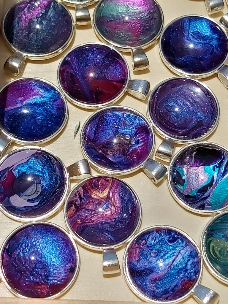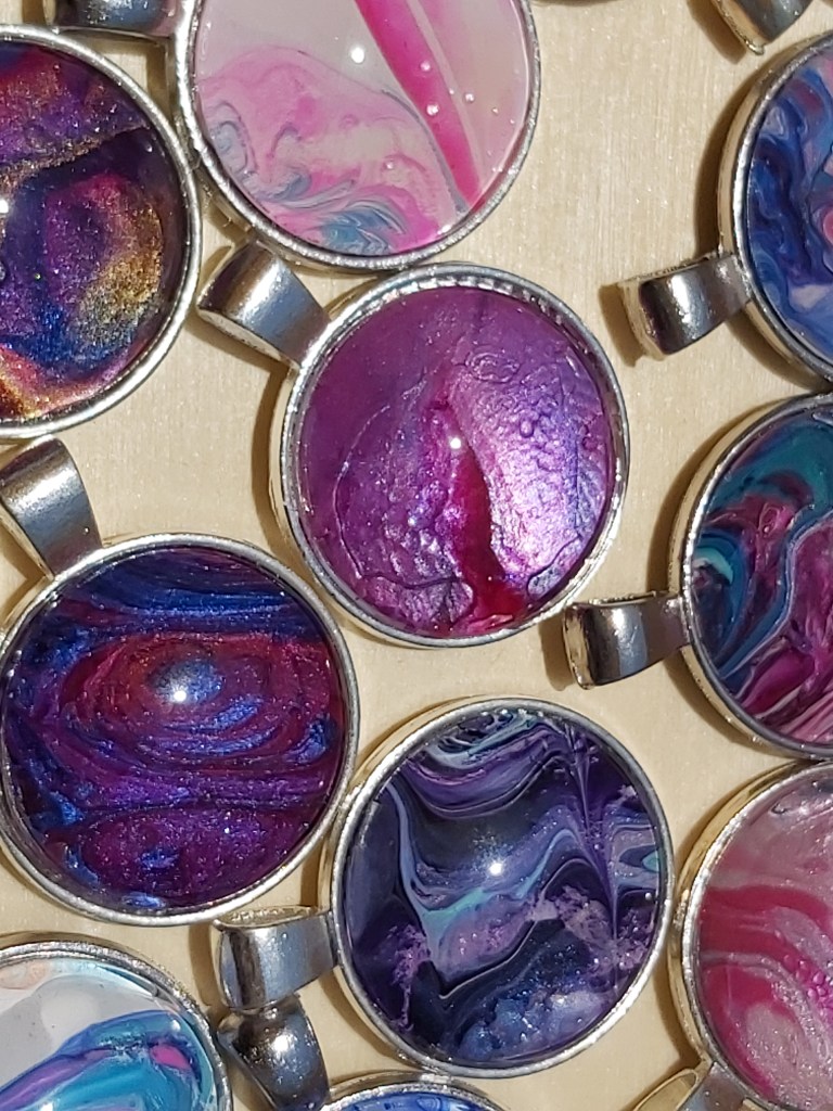 These pretty pendants are made from dried acrylic paint left on my tabletop after creating Dutch pour artwork. Each piece is completely unique and completed with a glass cabochon. Can be put on a chain to be made into a necklace, or put on a keychain ring to make a keyring. Sold individually or in sets, and would make a great party favour.