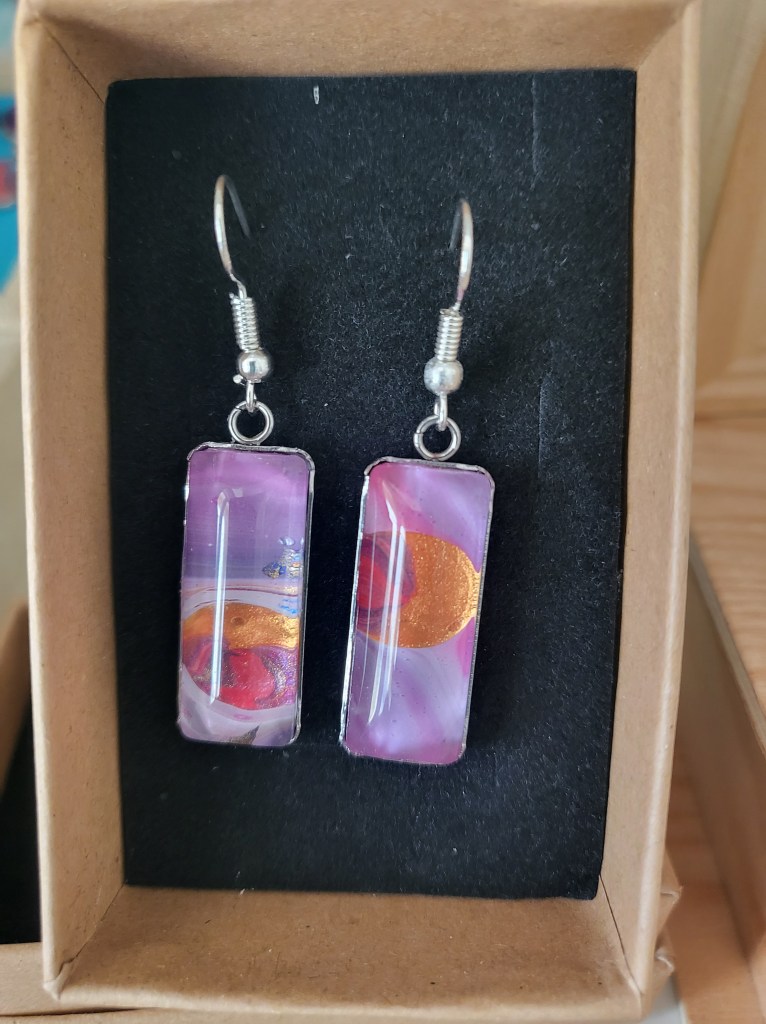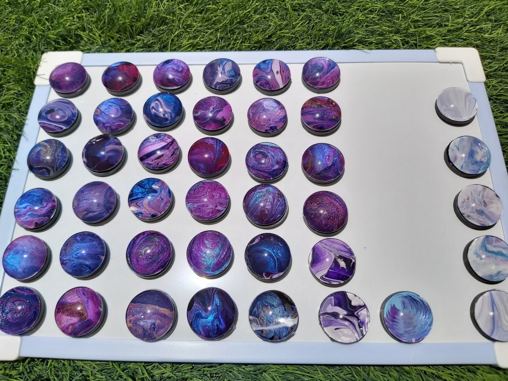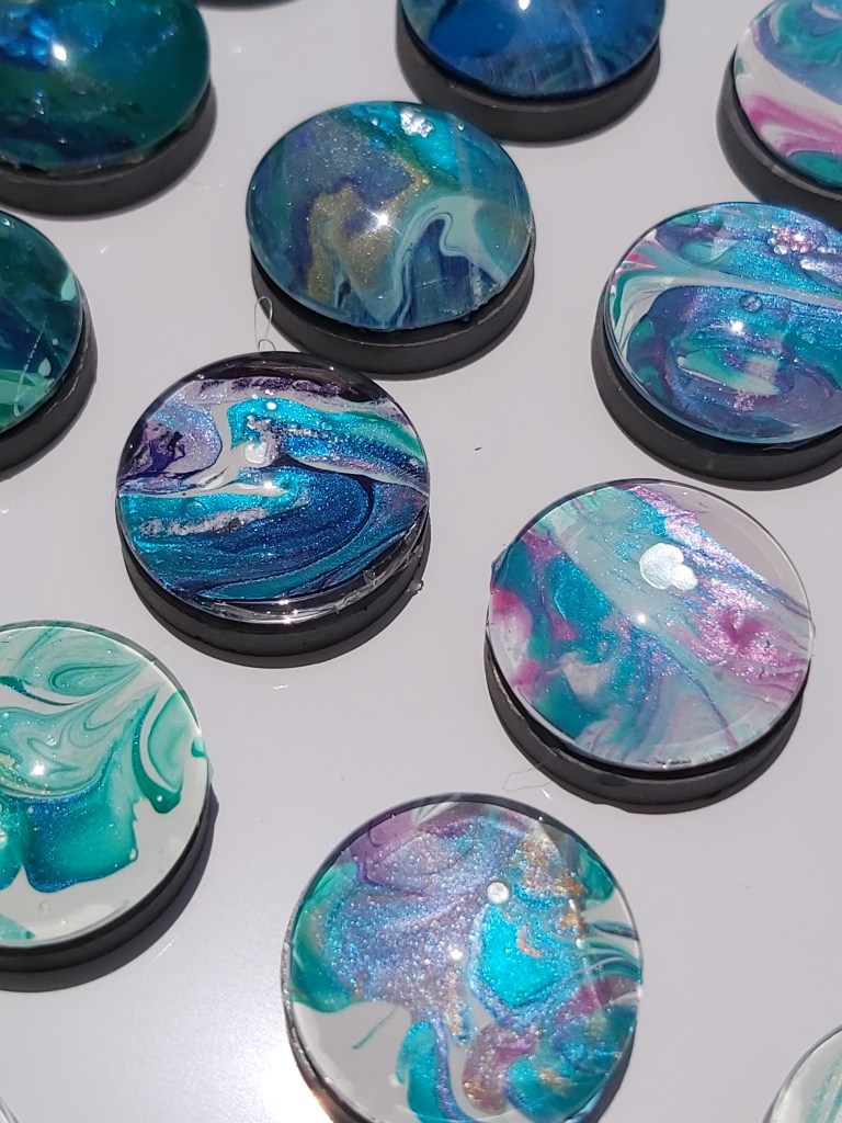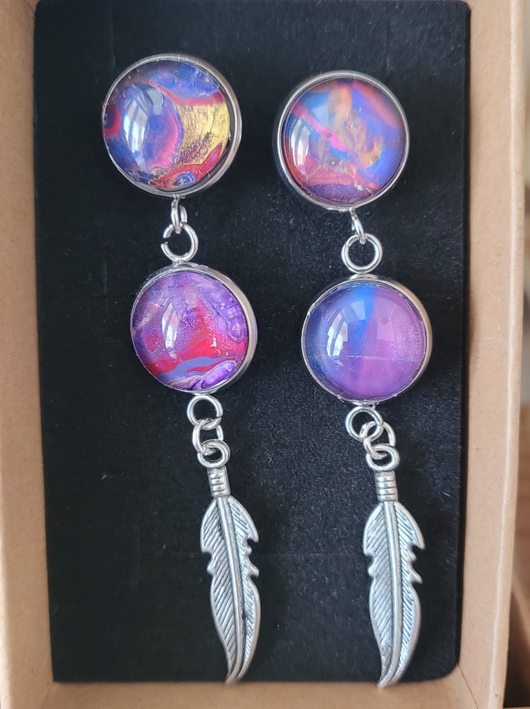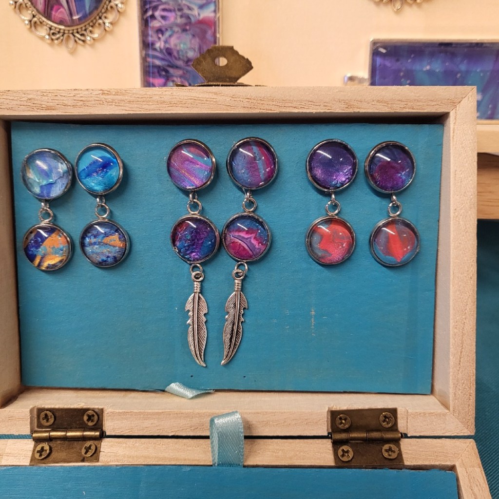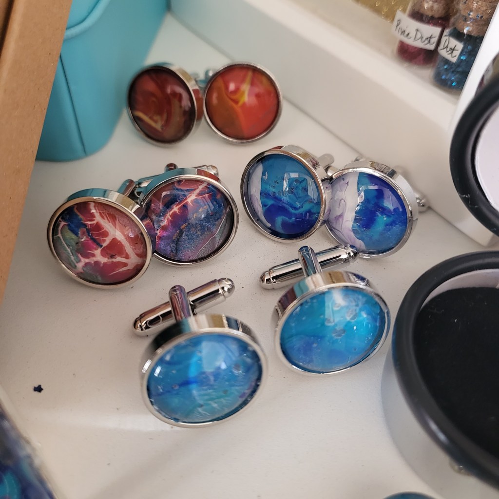 These pretty pendants are made from dried acrylic paint left on my tabletop after creating Dutch pour artwork. Each piece is completely unique and completed with a glass cabochon. Can be put on a chain to be made into a necklace, or put on a keychain ring to make a keyring. Sold individually or in sets, and would make a great party favour.