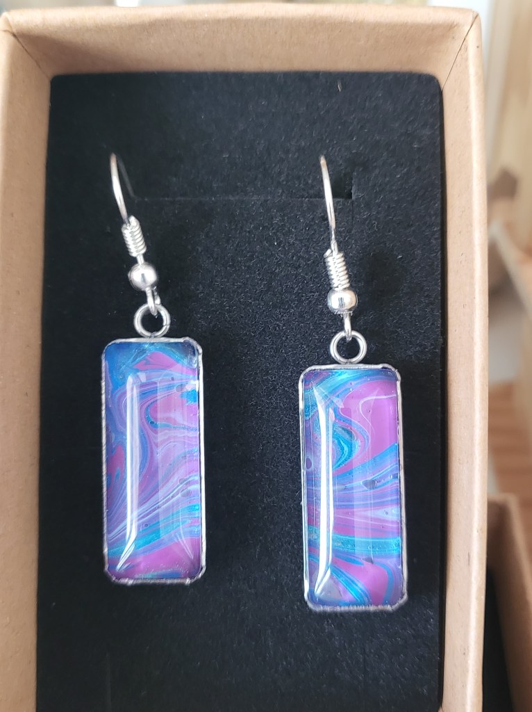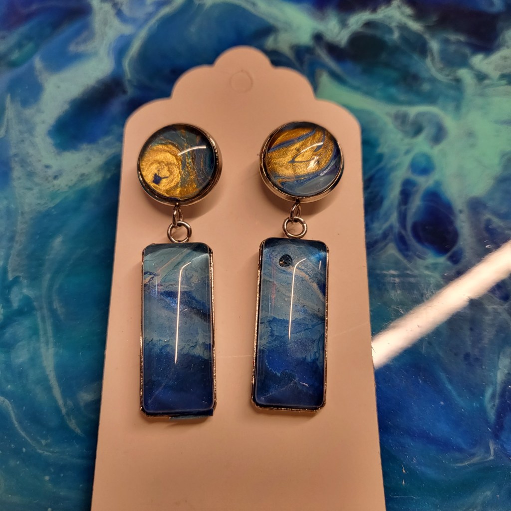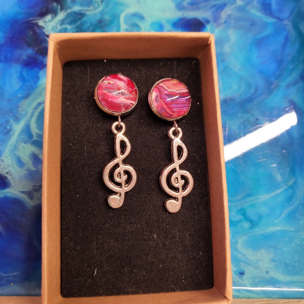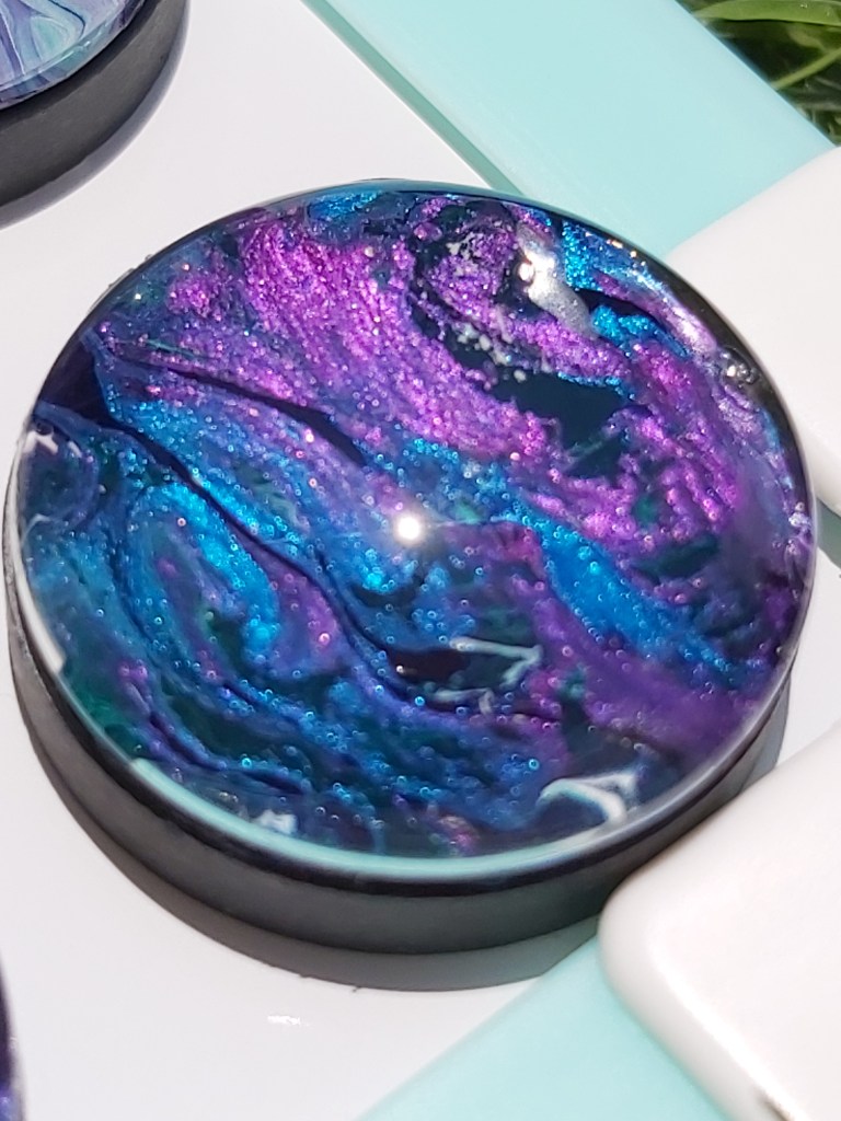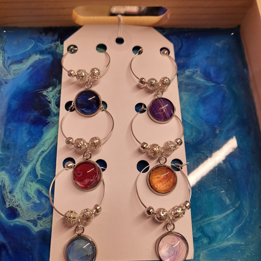 These pretty pendants are made from dried acrylic paint left on my tabletop after creating Dutch pour artwork. Each piece is completely unique and completed with a glass cabochon. Can be put on a chain to be made into a necklace, or put on a keychain ring to make a keyring. Sold individually or in sets, and would make a great party favour.