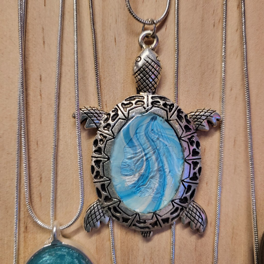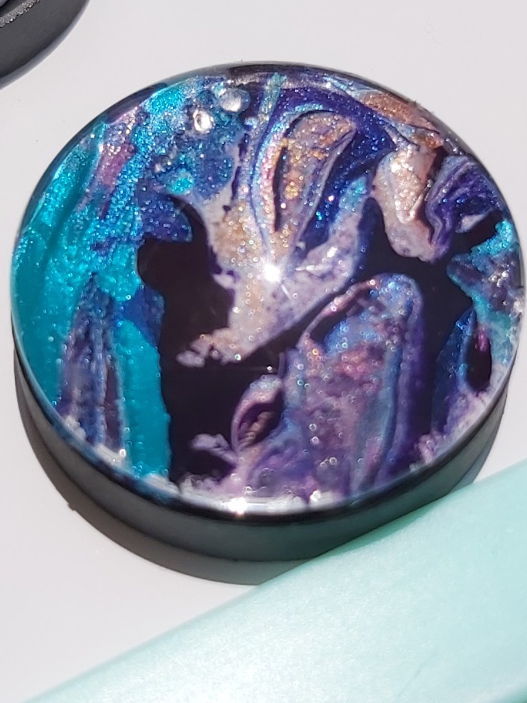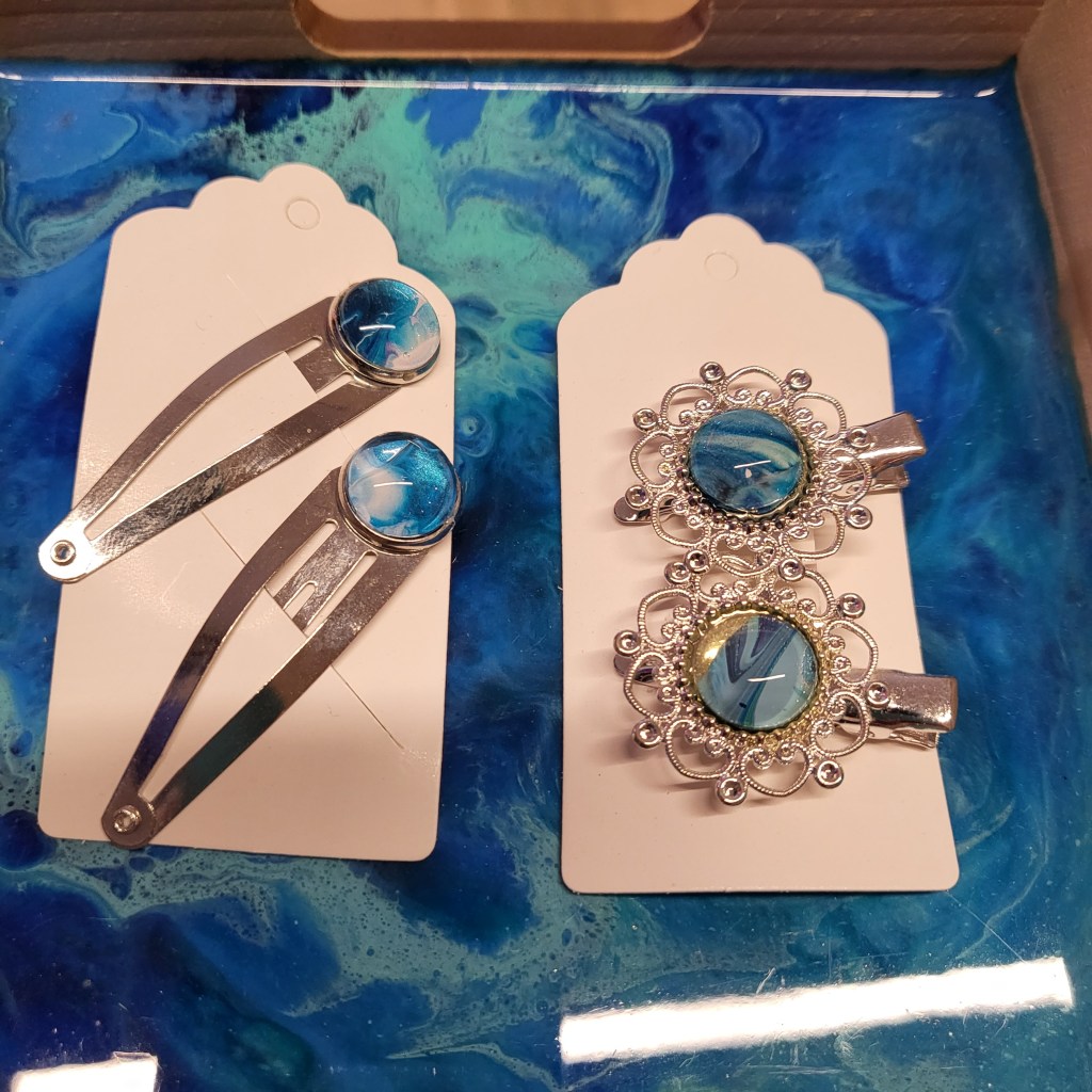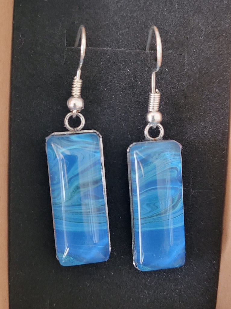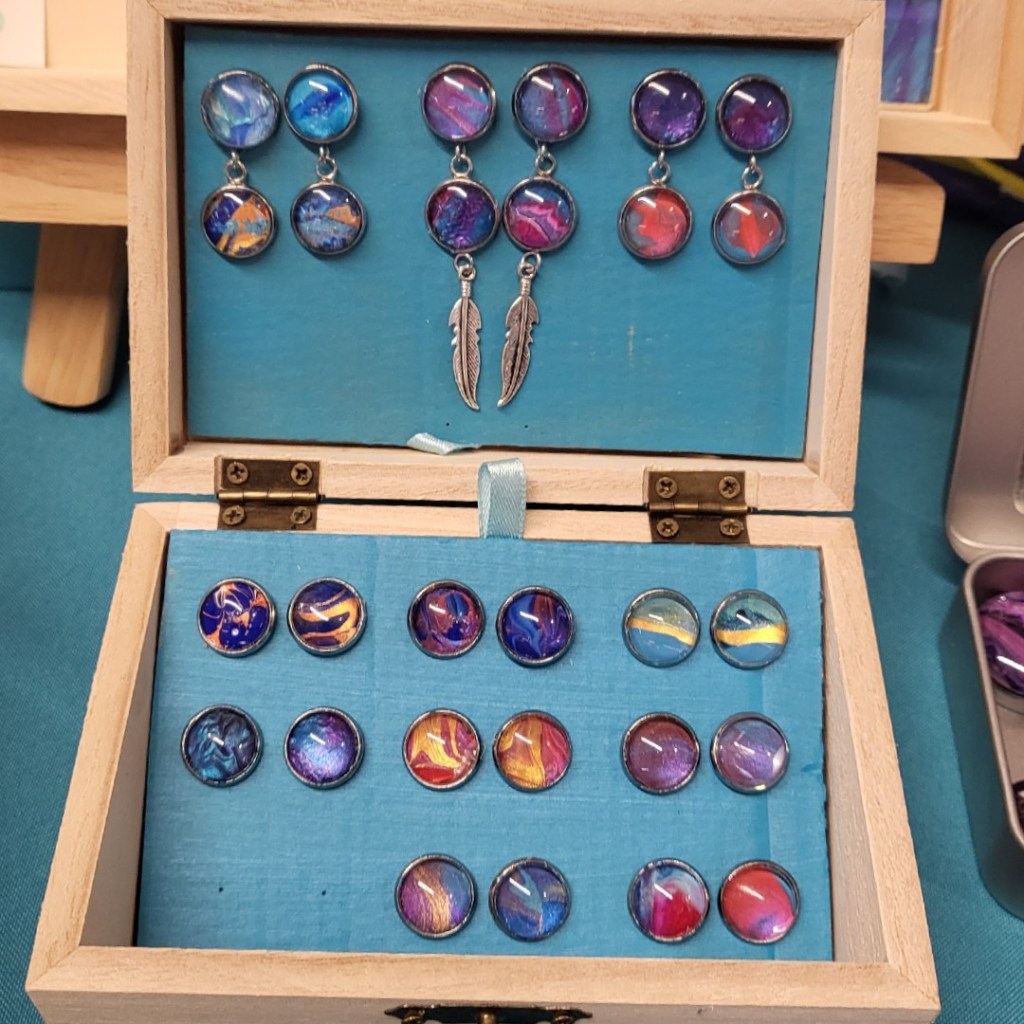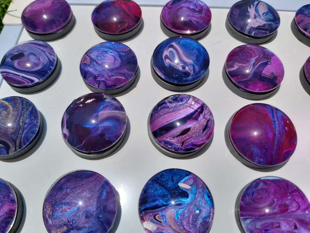 These pretty pendants are made from dried acrylic paint left on my tabletop after creating Dutch pour artwork. Each piece is completely unique and completed with a glass cabochon. Can be put on a chain to be made into a necklace, or put on a keychain ring to make a keyring. Sold individually or in sets, and would make a great party favour.