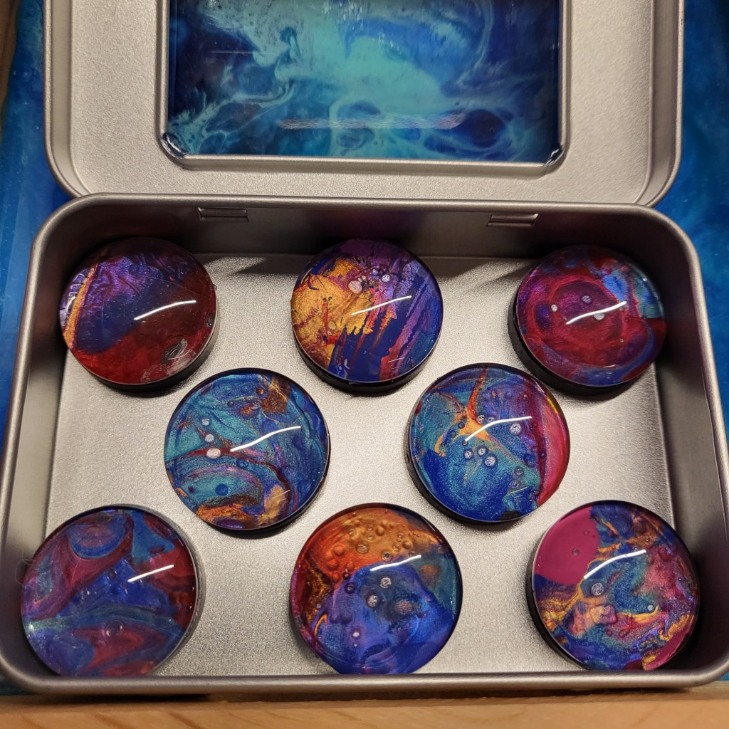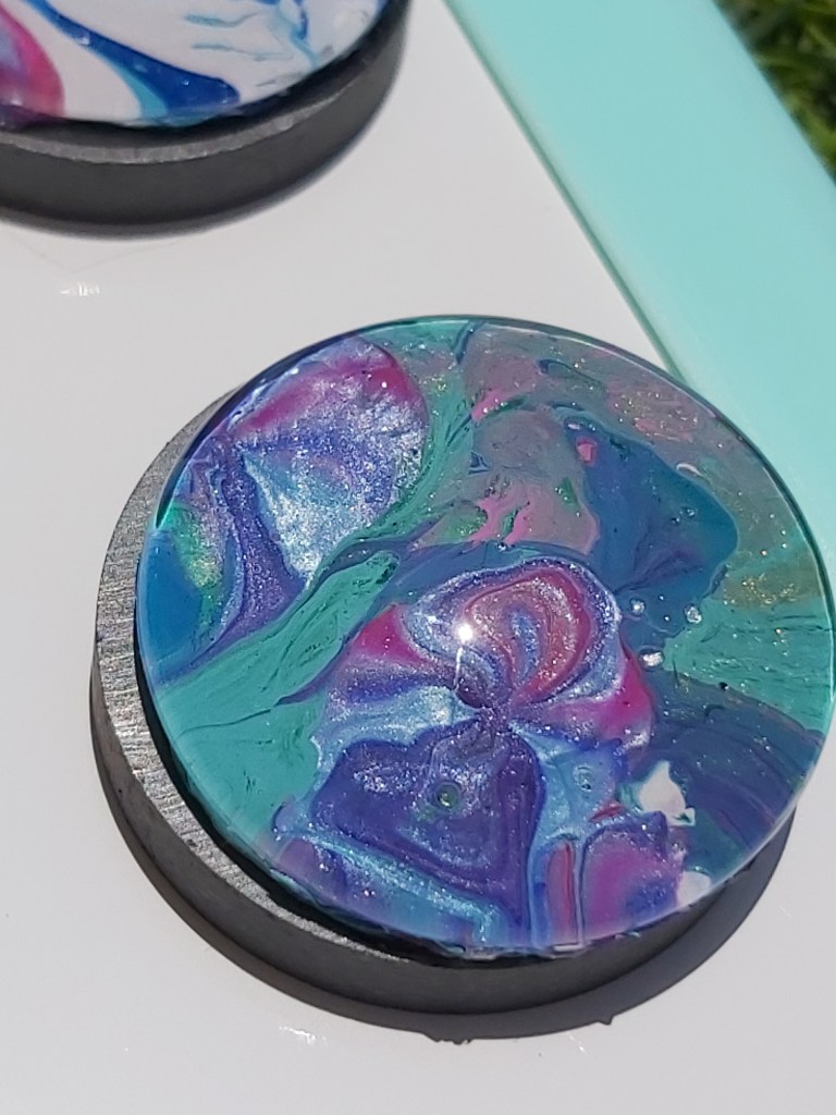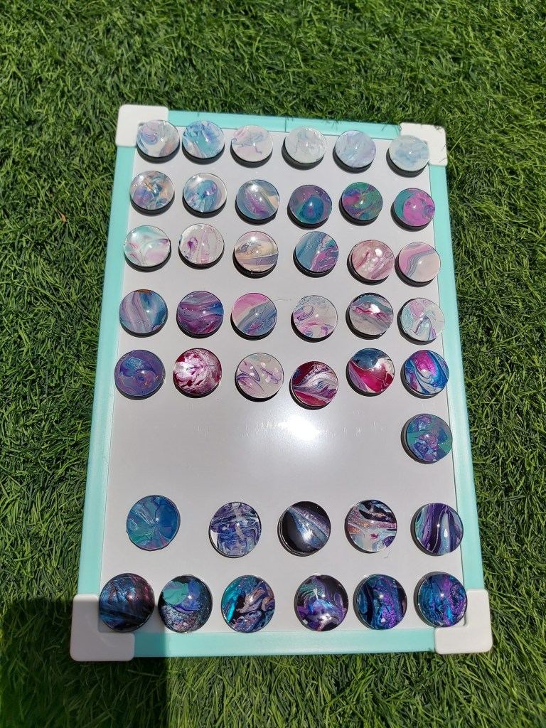 The magnets are also made from left over paint on my tabletop from my acrylic pour paintings. They come in a variety of colour combinations and are all completely unique, sold in sets of 6.